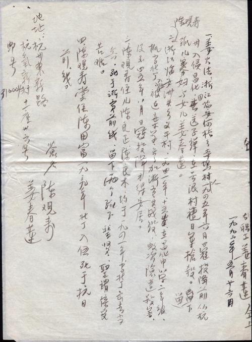 二、陈观寿:浙江临安洲头乡义干村。一九四一年,十五岁,在昌化中学二年级,抓当壮丁入伍,被迫弃学。参加浙赣等战役,数次险遭杀害,及至四五年八月日寇投降才得安居。