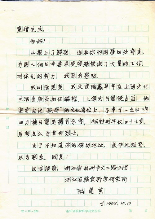 从报上了解到,你和你的同事四处奔走,为国人向日本要求受害赔偿做了大量的工作,对你们的努力,我深为感动。