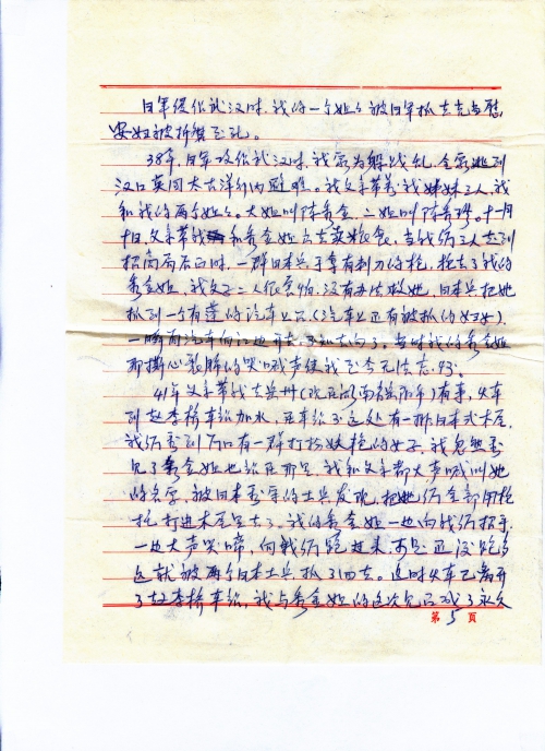 我家在日本侵华战争前,是一个殷实、富有的家庭,一家人幸福地生活着。日本侵华战争爆发后,特别是1938年10月日军侵占了武汉市以后,我家直接受到了日军的伤害:我的一个姐姐被日军抓走充当慰安妇折磨而死,我家房屋、财产共损失达623万元之巨(按人民币现价折得)。日军的伤害给我家造成了巨大的、无法弥补的精神创伤。