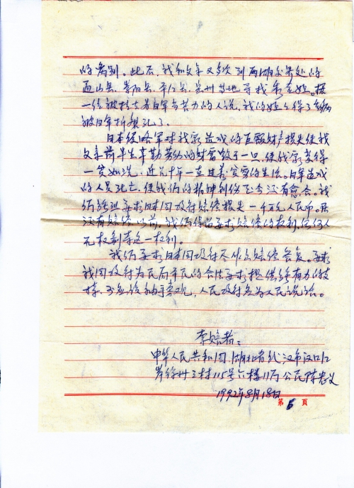 日本侵略军对我家造成的巨额财产损失,使我父亲前半生辛勤劳动的财富毁于一旦,使我家变得一贫如洗。近几十年一直过着贫穷的生活。日军造成的人员死亡,使我们的精神创伤至今还没有愈合。我们强烈要求日本国政府赔偿损失一千万元人民币。在没有赔偿以前,我们保留要求赔偿的权利,任何人无权剥夺这一权利。