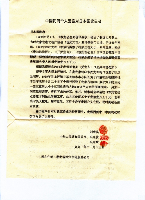1937年7月7日,日本发动全面侵华战争,侵占了我国大片领土,当时我家住湖北省广济县(现武穴市)龙坪镇仓门口垸,于1939年沦陷。1939年秋驻龙坪日军强行拆毁了我家三栋大小十四间房屋。根据《雅加达协议》、《开罗宣言》、《波茨坦公告》日本国必需对中国赔偿一切包括民间的战争损失规定,我强烈要求日本国现政府赔偿我房屋损失费人民币壹拾万五千元。