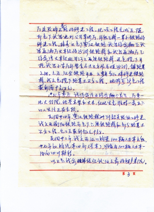 In the early years of the Republic of China, my father again organized a construction team to undertake two railway bridge projects between Shekou to Chenjiaji of the Jinghan Railway, and Daijiashan railway bridge project (the design was to run the railway toward west to pass Hankou Daijiashan, the bridge pier built by my father is still standing today). After completion, he also undertook the construction project of the Macadam Road from Hankou Houcheng Road (Now Zhongshan Road) crossroad to Laodazhimen. His next project was the construction of a small railway around Caohumen, and Waizuyuqiao of the Wuchang Electric Lamp Company. He continued with more projects including the Shahu Railway Bridge on Yuehan Railway from Wuchang Xujiapeng to Wuchang Tongxiangmen Railway Station, and two railway bridges on the Xunsi River from Wuchnag Tongxiangmen to Xujiawan Railway Station. He also carried out a project to dig earthwork of Zijinshan outside Wuchang Xiaochemen to fill sand lake and deploy road bed. When the Hanyi Railway began construction, he went to Mengxian County Yangtze River wharf to build railway bridge and was in charge of the road bed earthwork sub-project. At this stage, his contracting projects earned over 100,000 yuan.
