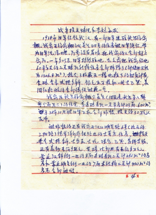 In 1938, the Japanese army occupied Wuhan, one division of the Japanese army entered and garrisoned at Wuchang Xujiapeng. The family residence at Xujiapeng was occupied by the Japanese Army to use as the Japanese Army’s bath house. There was a guard in front of the gate. They drove all of us out of our home by force. Within one year, the Japanese Army relocated their camp ground to other areas. Before their departure, they totally dismantled our two-storey brick and tile building with an area of 666.6 sqm (total usable area was 1306.8m2). They looted valuables (articles) hidden under the floor boards of the first floor, including: 20 catties of gold bullion and gold bar, 50,000 silver dollars and some ancient jade articles, all furniture items made of American red pine were plundered.