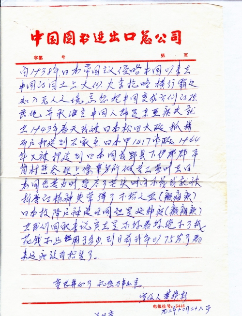 自1938年,日本帝国主义侵略中国以来,在中国的国土上大[肆]火、杀、抢、[掠]、横行霸道,如入无人之境,[妄]想把中国变成它们的殖民地,并承海言中国人都是东亚病夫。就在1943年春天,我被日本松田大阪抓捕,而后押送到石家庄。日本甲1417部队,1944年又被押送到日本国花野县下伊那郡平冈村熊谷组上條事务所做苦工。当时,在日本国出苦力时,受尽了苦头,时间不长,我就被折磨的精神失常得了不[治]之[症](癫痫疾)。日本投降后被送回国,但是,这种病(癫痫疾),在我们国家来说实在是不好看好,绝不了根,花钱不[知]用了多少,到目前二年[已]75岁了,看来这病没有指望了。