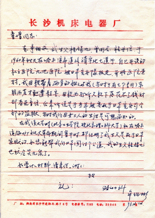 When I was in college (Beijing Institute of Industry, now known as Beijing Institute of Technology) and worked at the boiler factory of Harbin, political investigations proved that my father died in Japanese prison. If you could demand justice from Japan on behalf of my family, my father CHENG Xijiu would rest in peace.