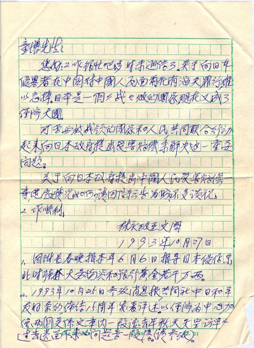 关于向日本政府提出中国人民受害赔偿一事,进展情况如何?请回信转告为盼?不多谈祝工作顺利