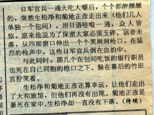 日军官兵一通大吃大嚼后,个个都醉醺醺的,突然生松净和菊地正彦走出来(他们几个单独一个包间),用日语哇啦一通,众人皆惊,原来他说为了保密大家必须玉碎。话音未落,从四面窗口伸出一个个黑洞洞枪口,在猛烈的枪声中,这些日军官兵倒在血泊中。