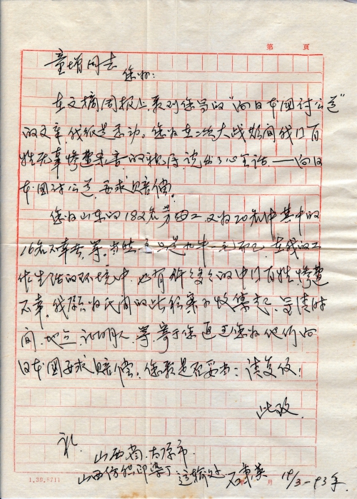 您为山东的182名劳工,又为20名中其中的16名不幸者等。当然这只是九牛一毛而已,在我的工作生活的环境中,也有许许多多的中国百姓惨遭不幸。我愿为民间的此种案子收集起,写清时间,地点,证明人等,寄于您通过您为他们给日本国要求赔偿,您看是否妥当:请复信!