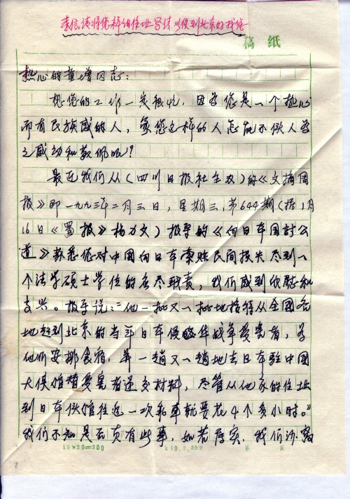 We read from the Feb 3, 1993 issue of the “Weekly Digest”(published by Sichuan Daily Press) an article by Yang Liwen entitled “Seeking Justice from Japan”. In that article we were pleased to learn that you are fulfilling the social responsibilities as someone with a Master degree in Law; to seek restitution from Japan on behalf of the civilians of China. According to this article, you “received groups after groups of victims of the Japanese War of Aggression against China, arranged for their room and board, and delivered victims’ materials to the Japanese Embassy in Beijing, even though it takes more than 4 hours to travel from your home and back!”We are not sure if this is a fact? If it is, we at Shawo Village would also like to come to Beijing and submit our documents on losses caused by the Japanese soldiers. In brief, over 3,000 houses, 4 temples, 3 ancestral halls were burned to the ground, 1 person was killed by the military dogs, and 5 persons burned to death. Total losses amount to RMB 35,000,000.