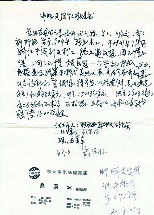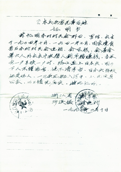 兹证明本村村民俞邦田,男性,出生于一九〇四年十月,一九四一年七月,因家境贫苦与本村村民俞连相、俞宝钱、俞善金等六人外出去宁波替人割早稻赚钱,当收完一户另换一户时,路上遇上日本兵,因乡下人不懂语言,说不清事由,日本兵怀疑他是坏人,一刀杀死抛入河中,从此没有回家。以上情况属实,特此证明。