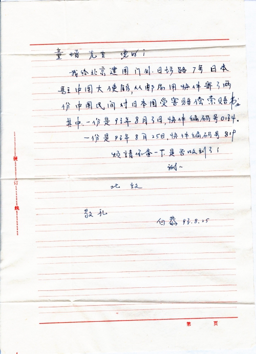 细节:请童增先生帮忙查下自己给日本驻中国大使馆寄的对日索赔书,日本是否收到。