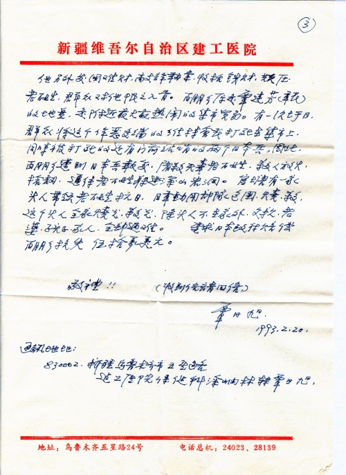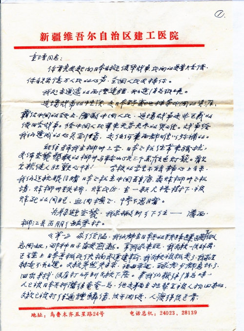 Address: 83002, Wuxing Road, Urumqi, Xinjiang, Tan Rixu c/o Tushan Youlin, Healthcare Section of Jiangong Hospital.
