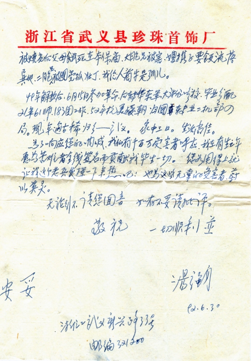 After liberation in the 1949, on June 15 I joined the revolution, later I was transferred to the East China Military University Zhejiang Campus. After graduation I was assigned to 183rd Regiment, 61st Division in the 21st Army. In 1952 I took part in the Korean War, and was transferred to the Fourth Bureau of the Second Machine Building Industry Department after returning from Korea. Now I have retired and returned to my hometown Wuyi. There are three persons in my family, and the life is satisfactory.