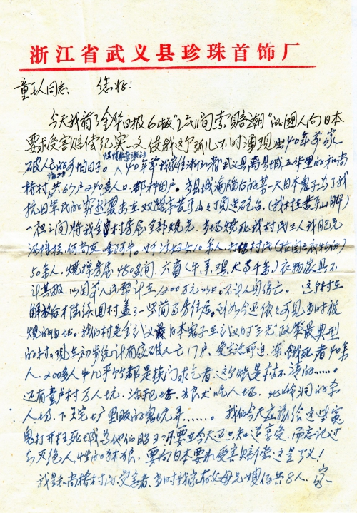今天我看了金华日报6版“民间索赔潮”的国人向日本要求受害赔偿记实一文,使我这个孤儿不时涌现出40年前家破人亡的可怕日子。[心]情非常激动,40年前我家住在浙江省武义县离县城五华里的和尚桥村,该村共67户240多人口,都种田户。当县城沦陷后的某一天日本鬼子为了我抗日军民的突然袭击在双路亭苦马山山顶造砲台。(我村在苦马山脚)一夜之间将我全村房屋全部烧光,当场烧死我村民三人,我胞兄汤梓桂、何尚友、金阿牛。奸污妇女10余人,打伤村民(抢闫已衣物的)50余人,烧掉房屋450多间。六畜(牛、羊、鸡、犬等千余)衣物家具不计其数,以目前人民币计在1200万元以上。不计人身伤亡。这个村在解放后才陆续回村盖了一些简易房住居。到如今还依依可见当时被烧的旧址。我们村是全武义日本鬼子在武义时“三光”政策最典型的村。现在初步统计有家破人亡门户,受生活所迫,冻、饿死者40余人,200多人中几乎个个都是挨门求乞者。这个帐是算不清的……。还有童卢村万人坑,活靶场,狼犬吃人场。此岭洞的杀人场,下王宅圹里畈的鬼坑等……。我们今天应该给这些冤鬼打开枉死城为他们昭雪、不要在今天还只知道享受,而忘记过去灭绝人性的豺狼,要向日本要求受害赔偿这是正义!