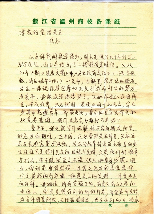 童先生,我也能深刻理解您与您的朋友所受的压力和困难,在中国,正如鲁迅先生所言,先驱者总是最为寂寞与孤独,为众民的幸福而奋不顾身的勇士往往不是得到民众的理解与支持,反是他们的嘲弄与打击,或干脆就置之不理,使人如置身沙漠。因此,我动笔写信给你,以我之无力的言语给你们之勇敢地行为一种道义上的支持,一种良知上的理解。我相信,所有觉醒了的,有良心有正义感的中国人,都会支持你们的所作所为,即使这种支持,为各种因素所限,无法直接表达,但在他们心中,将永远如是。