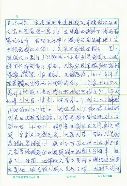My father Men Enlin rented a house and opened a small shoe shop in Ranfang Hutong, Daowai District in Harbin before the Liberation. He made the shoes himself and sold them in the shop (cloth shoes). When he was busy he would hire some apprentices. Even such a small shoe shop did not escape the evil hands of the Japanese. My late father had told us repeatedly: the Japanese wanted to requisition shoes, and ordered us to produce their order before a deadline. However, they gave neither money nor materials, yet under the threat of bayonet my father had no choice but to work day and night to complete the order. Little did he expect that when he pulled a cart to deliver the shoes by himself, he was arrested by the Japanese Military Police accusing that the delivery was delayed! He was imprisoned for several months, and severely tortured…… It was about 1942, when we ransomed my father out with a huge amount of money, he was barely breathing! Under the oppression of the Japanese invaders, we had no place to air our grievance, and nowhere to demand justice! I could not remember how much ransom was paid to rescue my father (my late father told me it was a large sum of money) I only knew that a small portion of it came from selling everything that could be sold in the small shoe shop. The majority was borrowed money from loan sharks! After my father returned, he was seriously ill, there was no money to seek medical treatment. The small shoe shop on which we depended to make a living for several decades was gone. What could our family of more than a dozen people rely on to earn income? At that time my grandma was nearly 70, my elder brother was only a little over one year, plus my two uncles and two aunts as well as their children, and my two unmarried aunts. My father wanted to commit suicide several times, but after much consideration he had no courage to abandon the old and the young. My mother stayed beside my father and cried every day, the whole family had no food, no clothing, no drug and no medicine; only the usurious loan with exorbitant interest rate ……How could we spend the days to come? Later on, an anti-Japanese armed force soldier whom my father had once helped with his hiding learned of our predicament, and gave us some drugs. He admired my father’s courage in not betraying him even under heavy torture. This underground party member told my father: You can rest assured, elder brother, take it easy, the Japanese would soon go away, the anti-Japanese armed force in other counties were fighting hard, Harbin would soon be liberated! It was these inspiring remarks that enabled my father to survive staunchly, and “persisted” till the Liberation! At last, a good era when the poor becomes master of the country was in sight.