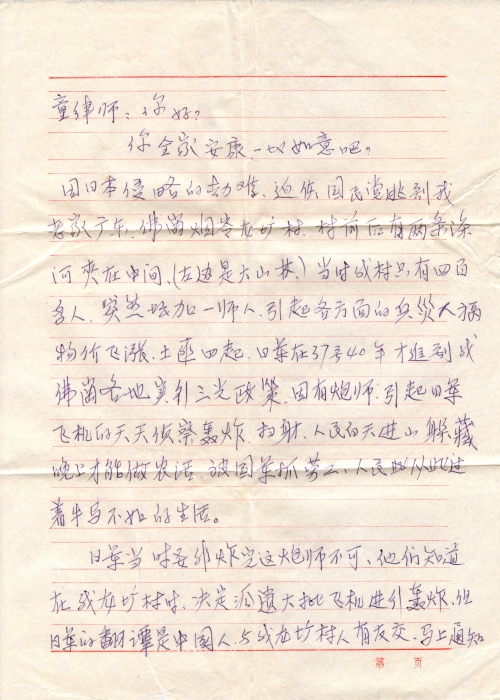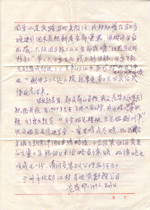 因兵劫劳累,超负荷的负担,我父范毕天(大支天),积病成疾,在1944年去世,年终只有48岁。我这娃儿缺奶母缺粮,为了度长粮荒,只有卖姐兄遭殃,五兄姐剩二个“半”,使我姐兄无法进学堂,一辈苦难我尽[尝],如我战后余祸不够条件向日本索赔债,三光政策血洒黄泉的先辈又怎能向日本侵略者索赔。如索赔这项我无一份,请问世界正义公理在何方?