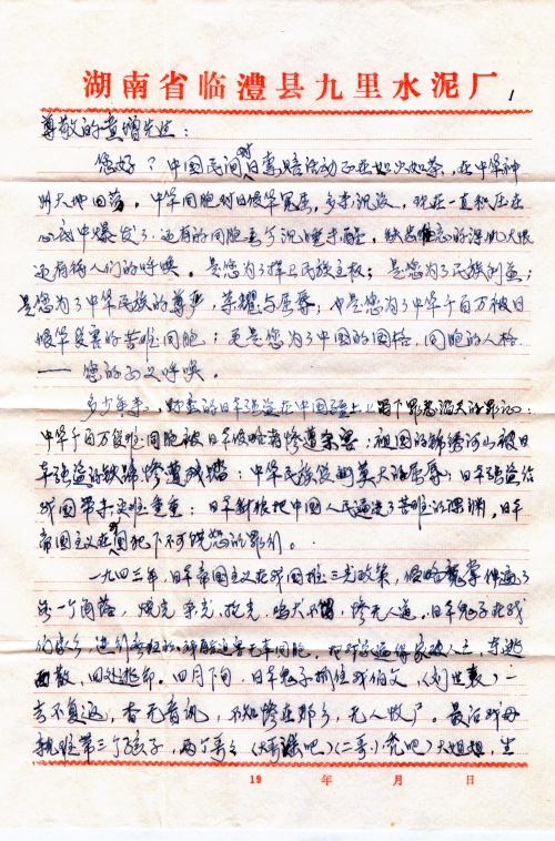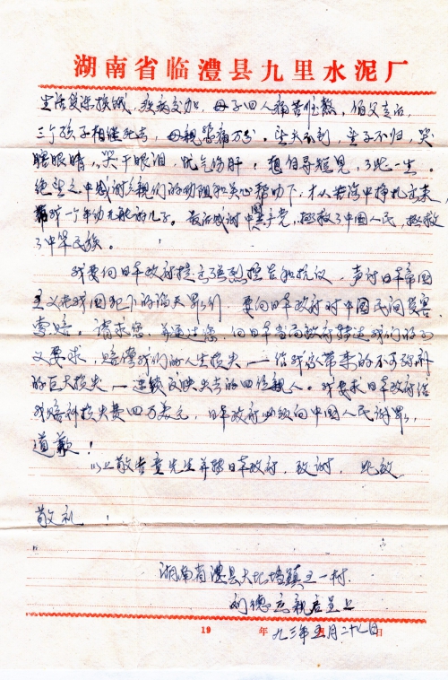 我要向日本政府提出强烈控告和抗议,声讨日本帝国主义在我国犯下的滔天罪行,要向日本政府对中国民间受害索赔。请求您,并通过您,向日本当局政府转述我们的正义要求,赔偿我们的人生损失——给我家带来的不可弥补的巨大损失,——连锁反应失去的四位亲人。我要求日本政府给我赔补损失四万美元,日本政府必须向中国人民谢罪,道歉!