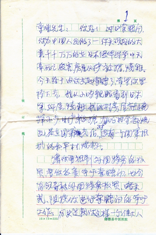 对日索赔问题,你为中国人民做了一件头顶好的大事。千千万万的在日本侵略战争中无辜死亡,受害房屋财产被抢,烧毁。今天终于由你发起索赔了,希望你坚持下去,我从小时亲眼看到日本军,奸淫烧杀。我的村房屋就烧[毁]不少,财产被抢。有的村全部烧光,是在国军逃走后,对只有一个国军抵抗的和平村烧杀。