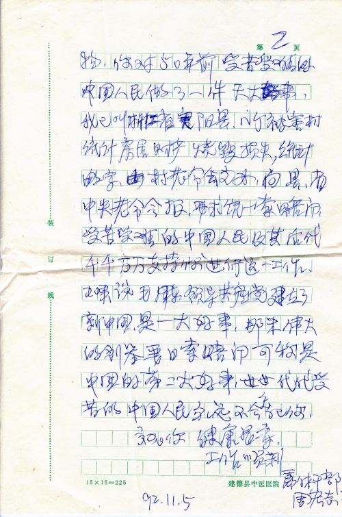 请你要抵制外国特务的收买,要你放弃呼吁索赔的,也会有领导被外国特务收买,暗杀或阻挠你进行索赔问题的呼吁、工作。历史造就你这样一个伟大人物,你对50年前受苦受难的中国人民做了一件天大的事,我已叫浙江省実阳县,几个被害村统计房屋财产烧毁损失,统计数字由村老龄会主办,向县、省中央老龄会报,要求统一索赔问题,受苦受难的中国人民及其后代千千万万支持你进行这一工作。如果说毛泽东领导共产党建立了新中国,是一大好事。那[么]伟大的创举要日赔偿问题可称是中国的第二大好事,世世代代受苦的中国人民永远不会忘记你。