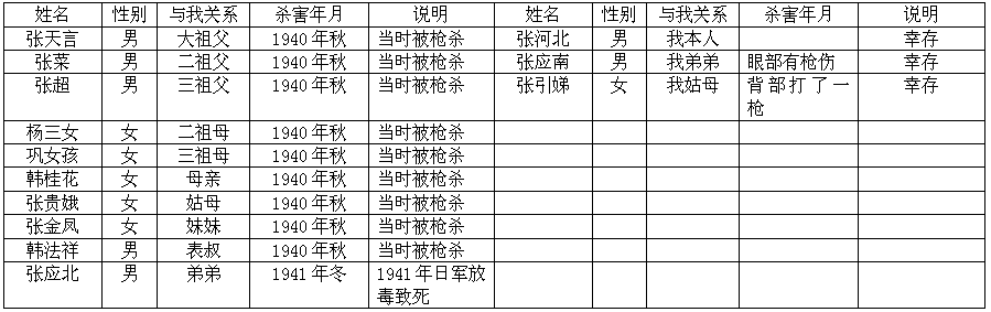 我的一个没有出嫁的姑姑,背部打了一枪,一直到半年后,才在八路军一个医院从背部取出一个手枪弹头来。我的大祖母腿上打了一枪(现老死),(我父当时跑了,我伯跑了,我叔父那时在抗大不在家,我的二弟张应北当时随我伯父在他姥姥家,1941年他被日军放毒毒死)其余人员全被杀害,见附表。