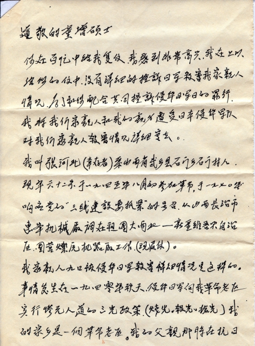 您在百忙中给我复信,我感到非常高兴。我在上次给你的信中,没有详细的控诉日军杀害我家亲人情况,为了和你配合共同控诉侵华日军的罪行,我将我们家亲人和我的亲身遭受日本侵华军队对我们家亲人杀害情况详细寄去。
