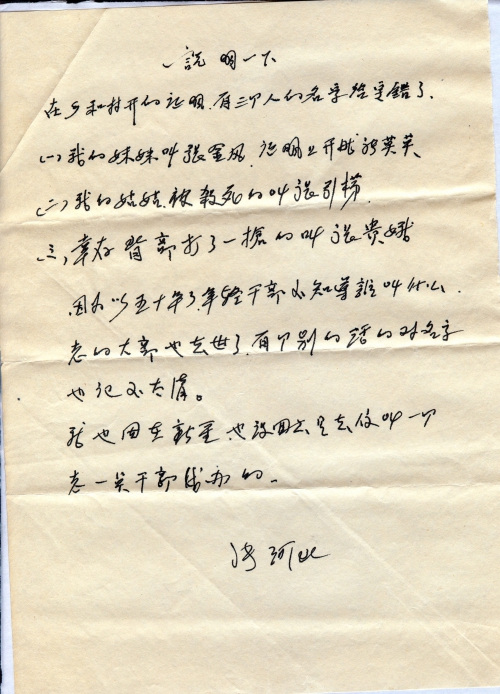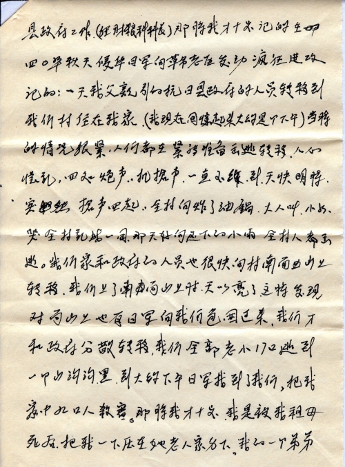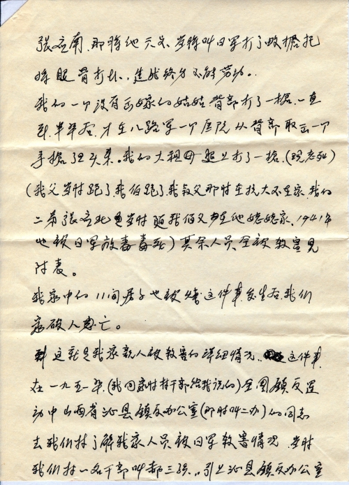 我家亲人九口被侵华的日军杀害的详细情况是这样的。事情发生在一九四零年秋天,侵华日军向我革命老区实行惨无人道的三光政策(烧光、杀光、抢光)。我的家乡是一个革命老区,我的父亲那时在抗日县政府工作(任财粮科科长),那时我才十岁,记得在四〇年秋天,侵华日军向革命老区发动疯狂进攻,记得一天,我父亲引的抗日县政府的人员转移到我们村,住在我家(我现在回忆起来大约是个下午),当时的情况很紧,人们都在紧张准备出逃转移,人心慌乱,四处炮声,机枪声一直不停,到天快明时,突然枪声四起,全村[像]炸了油锅,大人叫,小孩哭,全村乱成一团。那天好[像]是下的小雨,全村人都出逃。我们家和政府的人员也很快向村南面山上转移。我们上了南面山上时,天已亮了,这时发现对面山上也有日军向我们包围过来,我们才和政府分散转移,我们全部老小17口逃到一个山沟沟里,到大约下午,日军找到了我们,把我家中九口人杀害。那时我才十岁,我是被我祖母死后,把我一下压在她老人家身下。我的一个弟弟张应南,那时他六岁,当时叫日军打了数枪托,将眼骨打坏,造成终身不能劳动。