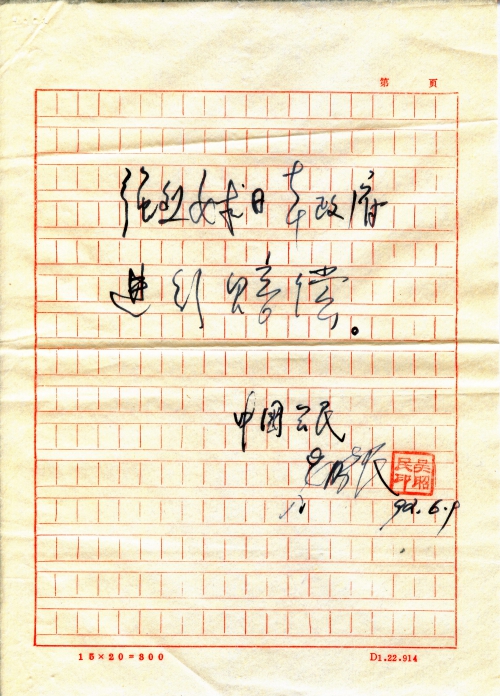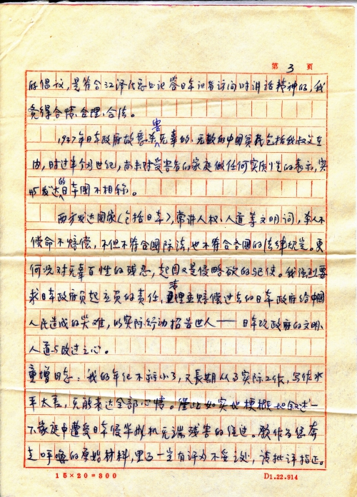 童增同志:我的年纪不算小了,又长期从事实际工作,写作水平太差,无能表达全部心情。谨此如实地梗概地叙述一下家庭中遭受日本侵华飞机无端残害的经过。愿作为您奔走呼唤的原始材料,里面一定有许多不妥之处,请批评指正。另一方面,请费神考虑,在不违背有关政策规定情况下,转交日本使馆、日本政府甚至天皇陛下。