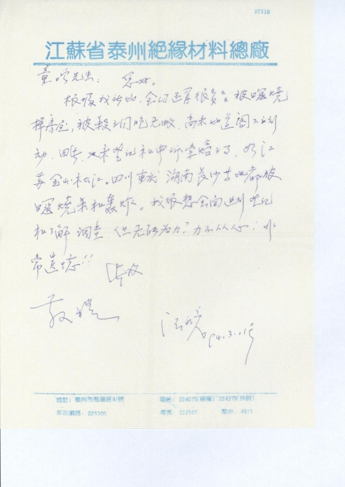 根据我所知,全国还有很多很多被日寇烧掉房屋,被杀之同胞无数。尚未知道阁下的行动,因此,也未登记和申诉赔偿之事,如江苏金山、松江。四川重庆湖南长沙等地都被日寇烧杀和和轰炸。我很想全面进行登记和了解调查,但无能为力,力不从心,非常遗憾!!