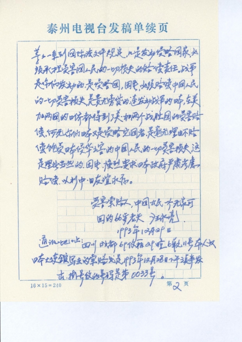 1945年8月15日你们侵略国无条件投降。根据《雅尔塔协议》《开罗宣言》《波茨坦公告》等一系列国际法文件规定,凡是发动侵略国家,必须承担受害国人民的一切损失的赔偿责任。战争是你们发动的,是侵略国。因此,必须赔偿中国人民的一切受害损失,是责无旁贷的。连发动战争的日本,在美加两国的日侨都得到了美•加两个战胜国的受害赔偿,何况你们日本又是侵略[他]国者。是毫无理由不赔偿饱受日本侵华之害的中国人民的一切受害损失,这是理所当然的。因此,强烈要求日本政府严肃考虑赔偿,以利中•日友谊永存。