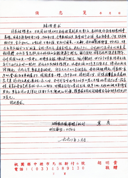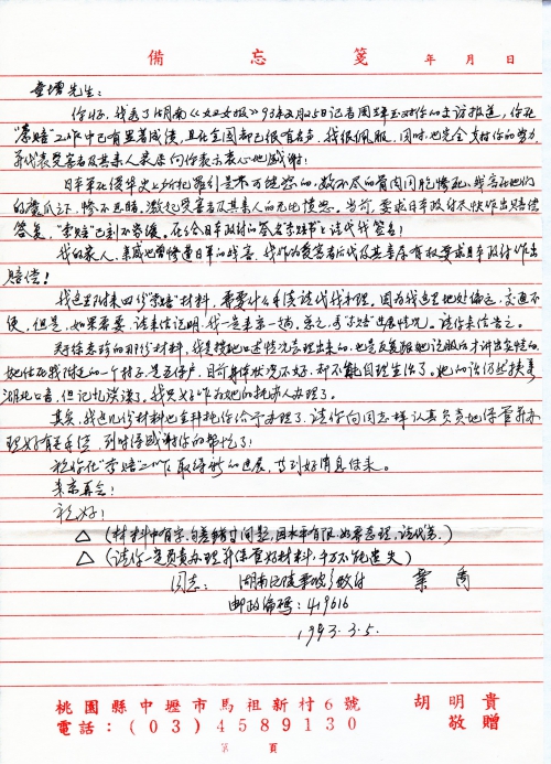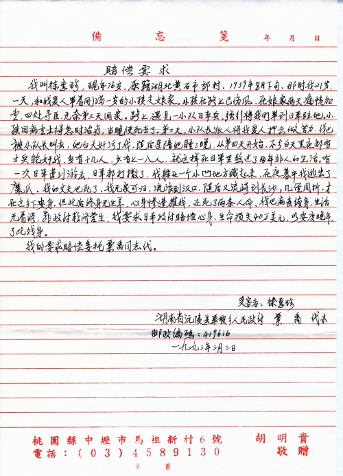 Hello, I read the report of exclusive interview with you by reporter Zhou Guangyu on the Hunan “Women’s News” on February 25, 1993. You have made significant progress in the work for compensation claims against the Japanese government and your reputation is well-known nationwide. I really admire your actions to demand Japanese compensations. I also totally support your efforts and wish to express heart-felt appreciation to you on behalf of all the victims and their family members!