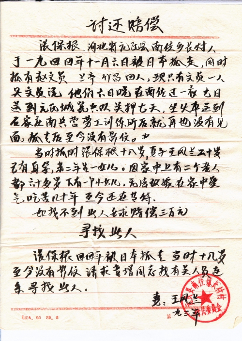 细节:张保根、赵文员、兰亭、竹昌四人于1944年11月6日被日军抓走,去当劳工,后只有赵文员一人回来。信中有村委盖章证明