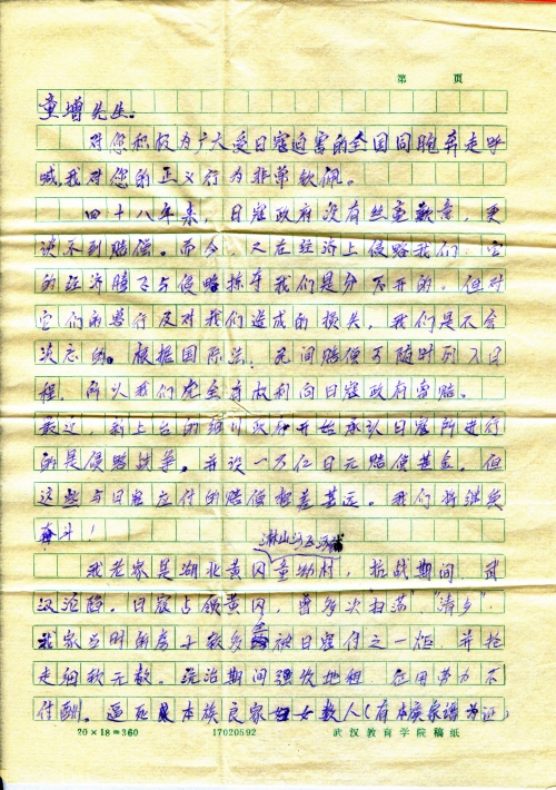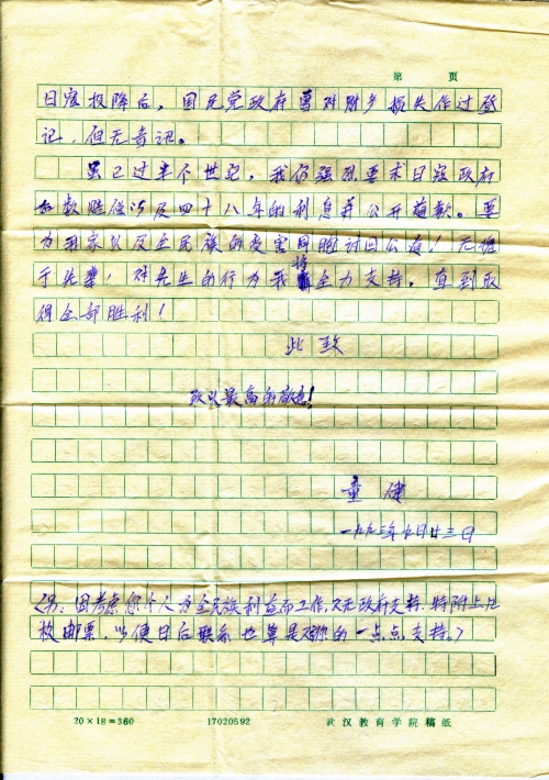 Hello, I hereby send you signatures of some of the victims of Japanese invaders in villages around my hometown (Huanggang, Hubei). What other things do I need to do? Please advise me. My son Tong Jian (now in university) really admires you. I also attached his letter to you.