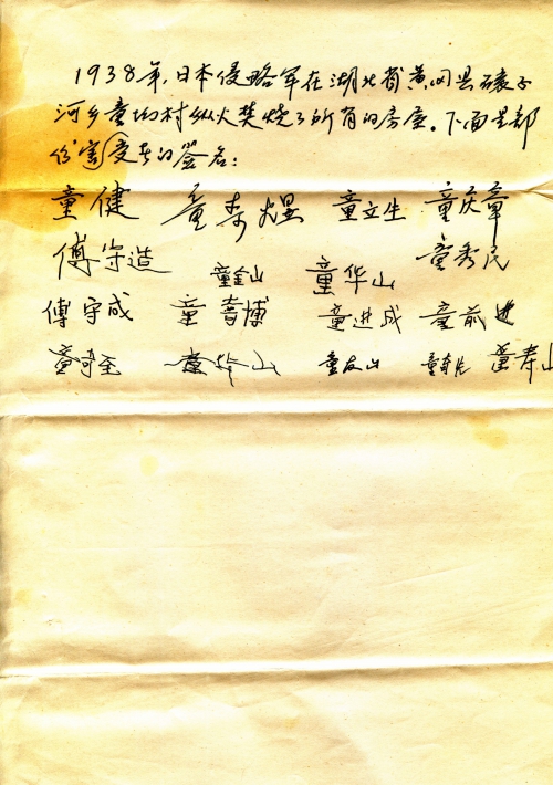 In 1938, the Japanese Invasion Army set fire to all the houses at Tong’ao Village, Gunzihe Town, Huanggang County, Hubei Province. The following are the signatures of some of the victims: