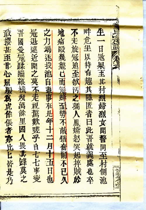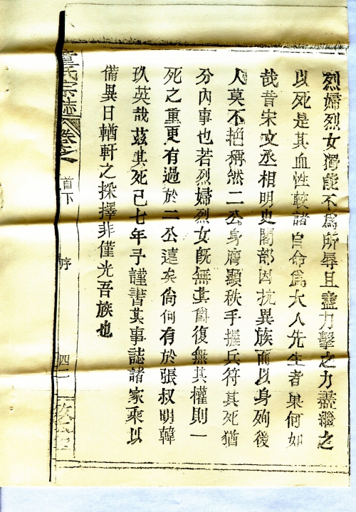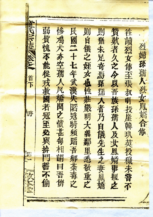 In the past when reading the history of heroines, in particular Zhang Shuming jumped off cliff and Han Jiuying jumped into cesspool, I couldn’t help but feel awed and hold high esteem for them. Today when learning of the deeds of Sun Ruren and girl Fengjiao in our clan, one would not feel surprised. Sun Ruren was the wife of Mr. Ziyi, and Fengjiao his niece. Both of them understood the principles of righteousness, for which all neighbours respected them. In 1938, Wuhan fell into the hands of the Japanese invaders. The enemy frequently raided our villages, committed numerous crimes, and looted everything. When Ruren and Fengjiao heard of the news, both felt indignant, and they vowed to each other: We are feeble women and could not join the army to save the nation. If the Japanese came we would certainly fight with them till death. As it turned out, the Japanese indeed came to their village. The heroines then moved to the side of the village and sat beside the pond. Someone advised them to look for a hiding place. They said this was the place where they would die a martyr. Soon the Japanese came, and wanted to rape them. Both Ruren and Fengjiao jumped up and wrestled the enemy to the ground, then beat them very badly. More enemy showed up, and they were immediately overwhelmed. They still fought on until exhaustion and committed suicide by jumping into the pond. This happened on December 15 of that year. After the Japanese retreated, people far and near heard of the news. Everyone felt astonished and awed. Since the July 7 Incident, our nation was invaded by the Japanese, and thousands of miles of territory were fallen to the enemy’s hands. People were scared of their ruthlessness and dared not fight them, some even yielded and became traitors. The heroines would not stand the humiliation and fought with all their strength till death. Their courage is admirable. Just like the past Prime Minister Wen Tianxiang in the Song Dynasty and Cabinet Minister Shi Kefa in the Ming Dynasty, who died honourably fighting foreign invasion. Both the heroines had neither their official titles nor any power associated with the titles, but their deaths are more illustrious than the deaths of these two nobles, and more comparable to Zhang Shuming and Han Jiuying. On the occasion of the seventh anniversary of their deaths, this article is hereby written to record their honourable deeds, so as to commemorate their selfless contribution to the nation one day in the future, which will also glorify our clan.