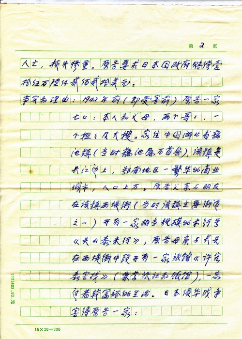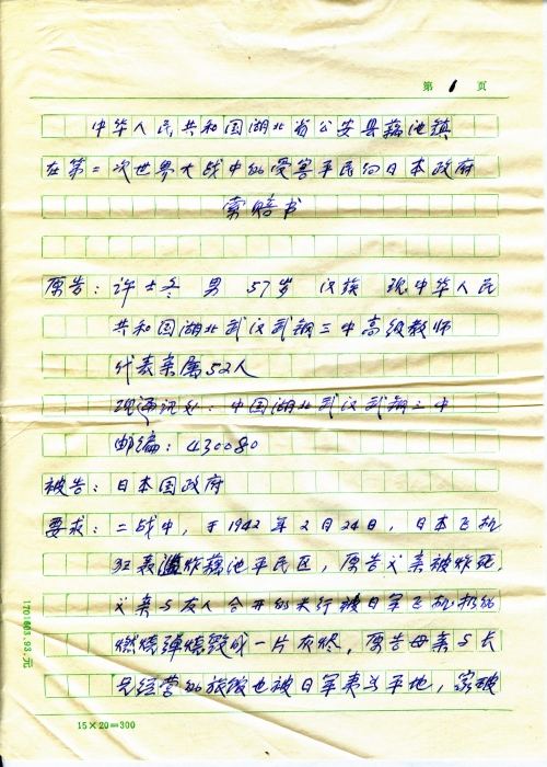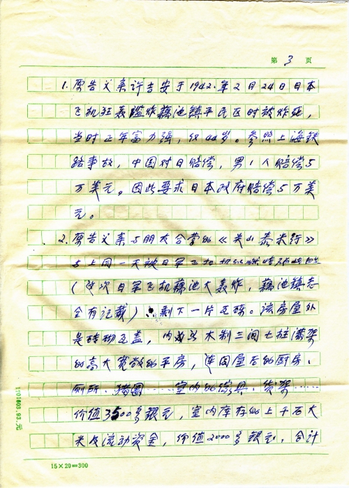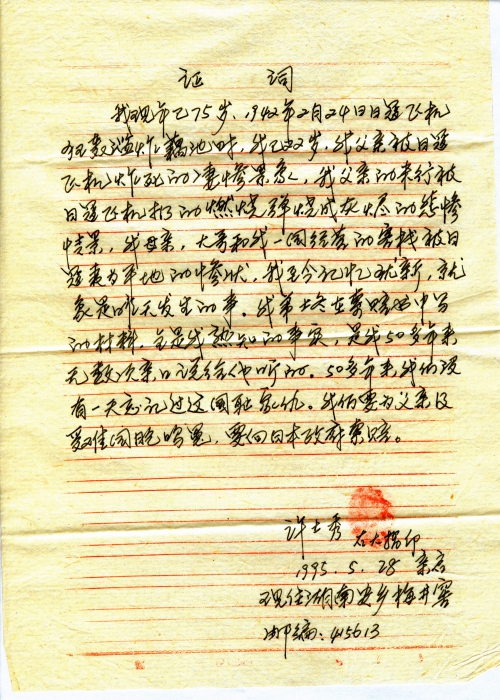 I’m 75 this year. On February 24, 1942, when Japanese aircrafts indiscriminately bombed Ouchi, I was 22. I still remember vividly the scene my father was killed by Japanese aircrafts, and my father’s rice shop being burned to ashes by the incendiary bombs dropped by Japanese aircrafts, plus the terrible scene of the inn jointly run by my mother, my older brother and myself being razed to the ground by the Japanese bombing, as if they happened only yesterday. The testimonials written by my younger brother Shidong in the claim letter are all facts which I’m very familiar with. They were stories I have told him countless times over the past 50 plus years. We can never forget this national shame and family calamity. We want to seek justice for my father and all compatriot victims. We demand compensation from the Japanese government.