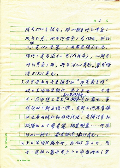 2. The “Guanshantai Rice Shop” jointly run by the Plaintiff’s father and his friends was destroyed by incendiary bombs dropped by the Japanese aircrafts in the same day (the Ouchi Town has complete records of the bombing and the destruction), leaving behind only a pile of rubbles. The house had a brick exterior and a tile roof. It was a spacious bungalow with three large rooms partitioned by wood and seven columns. There were kitchen, toilet, and pigsty at the rear of the house……furniture items and shelvings in the house……worth over 3500 silver dollars. There were over 70000 kg of rice stock stored indoors and working capital, worth over 2000 silver dollars. Total loss amounted to over 5500 silver dollars. Based on 100 silver dollars equivalent to 50 grams of gold, and the current market price of gold being 138 yuan per gram, we adopt 125 yuan per gram, 50 gram of gold is worth 6250 yuan, current price 1 US dollar is worth 8.2 yuan (RMB), 100 silver dollars can be converted into 50 grams of gold, namely US$ 762.2. We demand compensation of US$ 41,921.