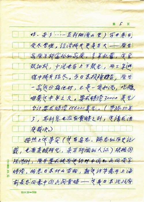4. When the Japanese army occupied Ouchi, i.e. February 1943, the Plaintiff’s whole family including orphan and widow, old and young, totaling six persons, fled to western Hunan (Changde, Anxiang……Taoyuan Mountains), far away from our hometown, suffered all kinds of hardships, and the economic loss was huge. The Plaintiff’s family was previously relatively wealthy, with many years of savings, along with jewelry and valuable, the total should be more than 10,000 silver dollars. All these were completely exhausted in the three years of exile life. After the Japanese surrendered, the Plaintiff’s family returned to Ouchi. The whole family was in dire poverty, and had to live frugally all year round. I demand compensation of US$30,000. Total compensation amounted to US$156,220. (The loss took place 50 years ago. The interest should also be counted into compensation, subject to court ruling.)