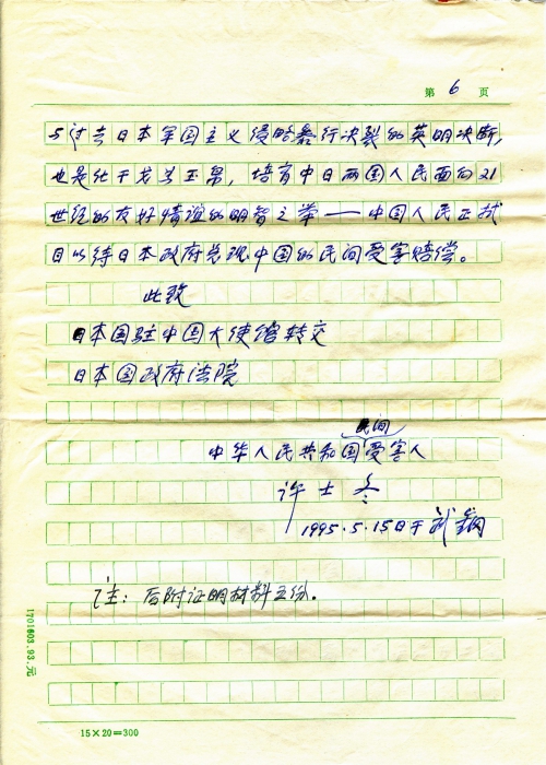 Based on the above facts (including historical records from county annals, and town annals, plus witness testimonials) and international law, the Plaintiff demands the defendant to offer compensation to Chinese civilian victims. It has been reported that during Japan’s Prime Minister Murayama’s recent visit to China, he agreed to give civilian compensation before leaving Shanghai. This is a prudent decision for the incumbent Japanese government to break away from the position of the past Japanese militarism, turning hostilities into peace and harmony, and fostering amicable friendship between China and Japan to embrace the 21st century. The Chinese people is eagerly looking forward to seeing the Japanese government honour its pledge for civilian compensation in China.
