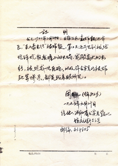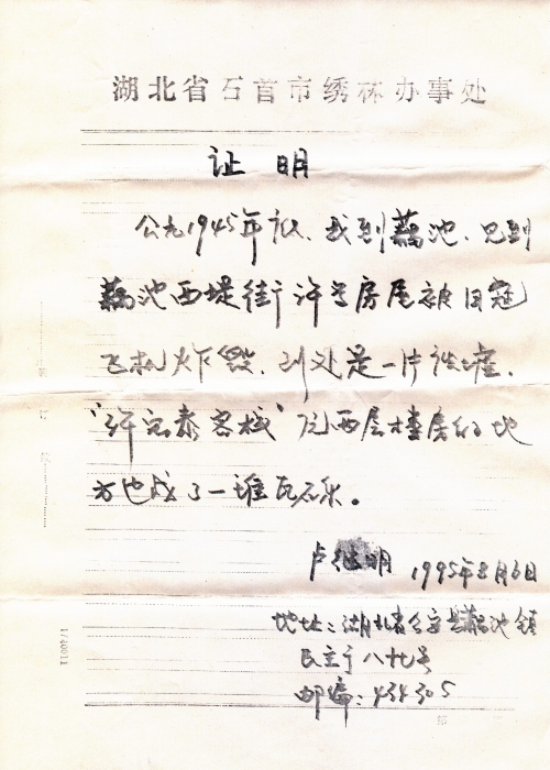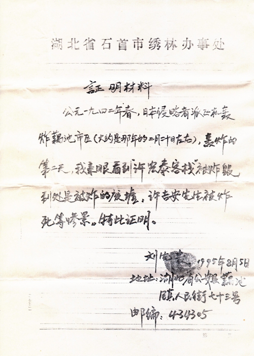 In the spring of 1942, Japanese invaders dispatched aircrafts to bomb Ouchi downtown area (around February 20 in that year). The next day after the bombing, I personally witnessed “Xuhongtai Inn” being destroyed, with rubbles everywhere, and the horrible scene of Mr. Xu Ji’an being killed. This statement is hereby made.