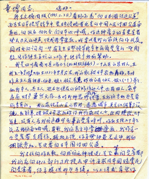我在文摘周报(1993.2.3日)看到你为“像日本讨还公道”而为在日本侵华战争中,受日本侵略者迫害的中国人民讨回公道而奔忙,向政府,向社会,向日本国呐喊,您这种崇高的为受害者发出正义的呼声,使我非常崇敬,我要代表我的家族向你致敬。同时也[想]询问一些有关在日本侵华战争中民间受害的一些问题,望你能在百忙的工作中,能给予我们帮助。