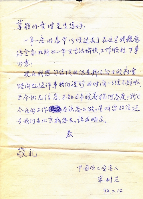 现在我想向您谈的仍是我们向日政府索赔问题这件事我们进行的时间[已]经不短啦,至今仍无信息,不知日本政府抱何态度?我们今后的工作应该怎么做?是听您的信,还是我们去北京找您去?请求明示。