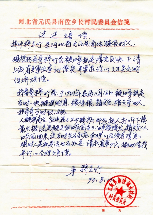 细节:1944年穆竹昌18岁时候,被日本军抓走,一起抓走的还有张保根、赵文贞、张兰亭。最后,穆竹昌没有了音讯,不知死活。注明:信中有村委的盖章证明。