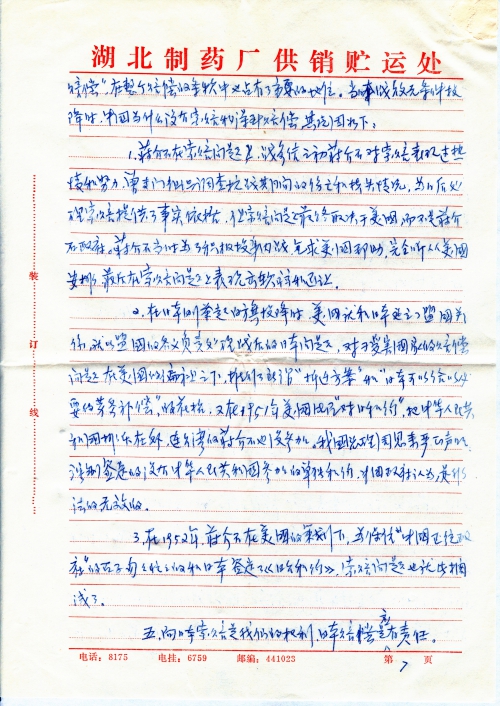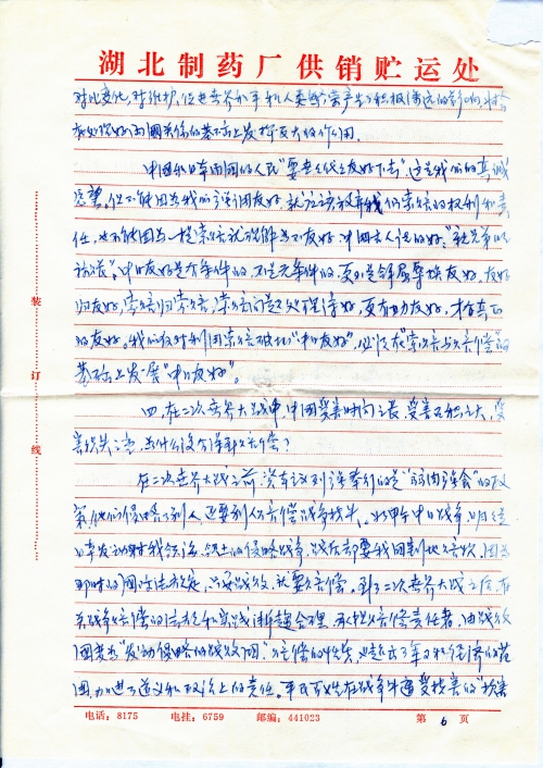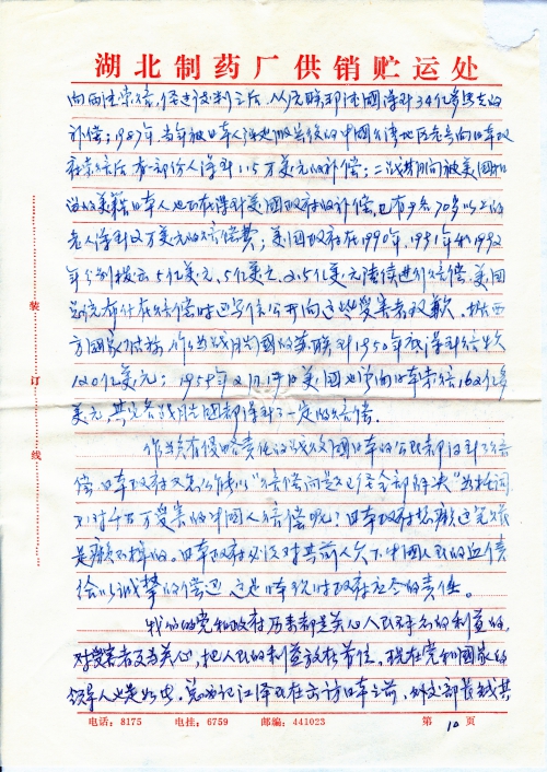 Fourth, except governmental mass organizations that work for the government, there isn’t a single mass organization that can undertake the task of claiming for compensation. Therefore, I think that the most urgent problem to be solved is to establish a top-to-bottom organization (or a unit designated by the government) to take the responsibility of claiming for compensation and making full preparations by carrying out extensive compensation-related work to promote the realization of compensation. I’m afraid I have to stop now.