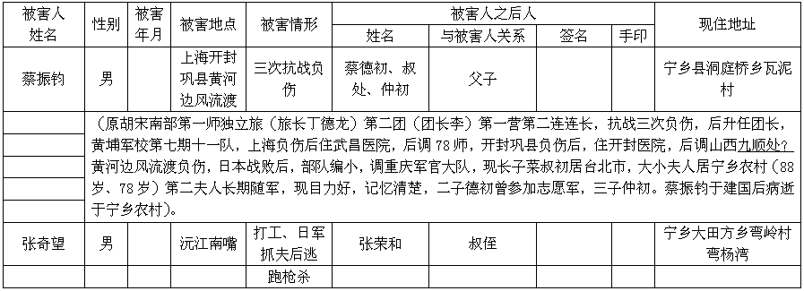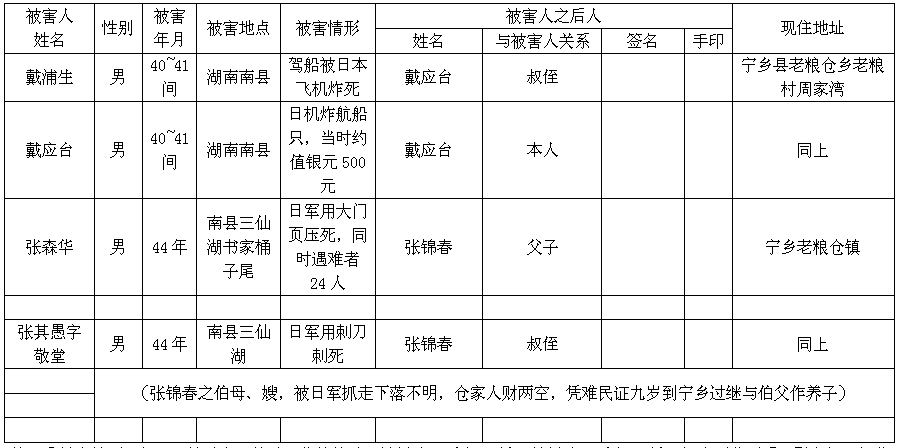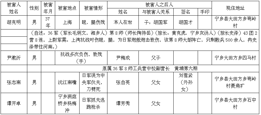 注:①被害情形一栏,可填杀害、枪杀、集体枪杀、被奸致死(疯、残)、轮奸致死(疯、残)、抓夫下落不明、慰安妇、细菌实验等。②手印均以右手食指。
