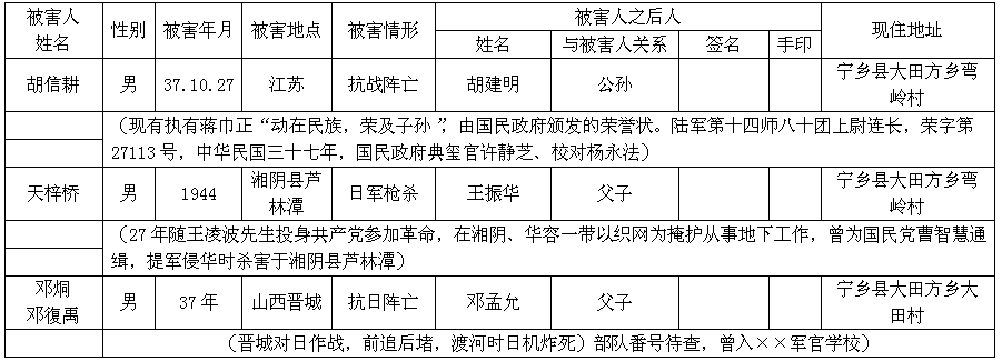 今寄上一批受害者名单,另尚有50余人因在另一本登记本上,下次再寄来。南县厂窑大屠杀载入了史册,还有沅江马公铺,我准备重点走访,现已委托人去宣传发动登记了。另常德一个师的国民党军,几乎全部阵亡,我拟到南京查找档案,再分省发出由各省查找其后人(不知怎样和各省联系)南岳山忠烈祠上也记载了大批国民党阵亡将士,亦可到南京查找。但目前企业不景气,人员大量外流自谋职业,我暂离不开生产岗位,只能利用休假(旅客乘船时做过宣传,但中青年居多,效果不理想)时间去做这项工作,常德、南岳、南京等地尚未成行,好在南县厂窑和沅江马公铺在我们船线左近,可望搞好。我感觉到:不能动用国家宣传舆论工具,宣传发动尚有大量工作要做,且不知七届四次,五次人大代表回省后是否宣传了这一提案,下层人民知之者极少,甚至县团级单位的党委,政工人员亦回说“政府不要赔偿了。”同时,我还遗憾地感觉到:我国人民的民族感,民族使命感,党悟程度都相当低,远不及开放意识;对政府和民间的概念模糊,有的竟抱不相信态度。因此,我考虑:宣传发动工作,大量案卷资料的查找,受害人的落实对证、时间、经费、都有困难。但也有受害者愿意资助,不知是否能接受和发起资助?