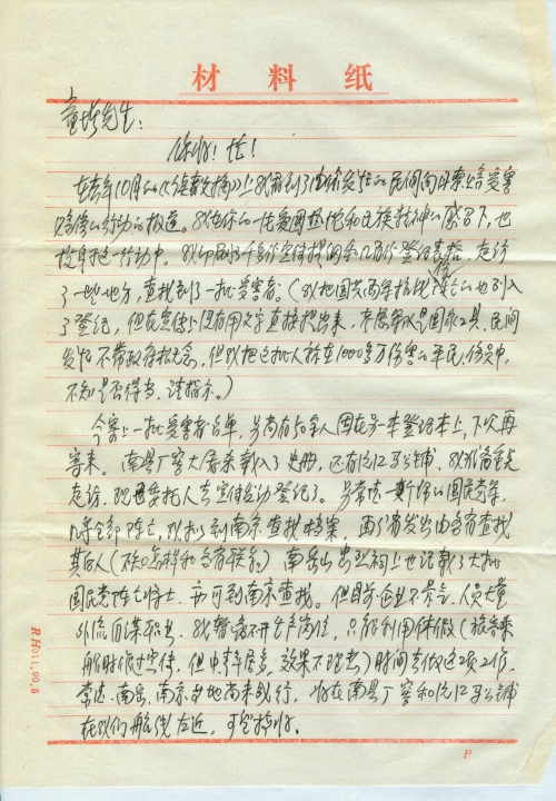 细节:我在您的爱国热枕下也投身到索赔工作中,工作之余搜集到一些资料。寄来向日本国要求“受害赔偿”的宣传提纲。寄来受害调查表,张奇望、谭开卓被日军做挑夫后枪杀等其它受害情况,统计包括抗战牺牲人员。