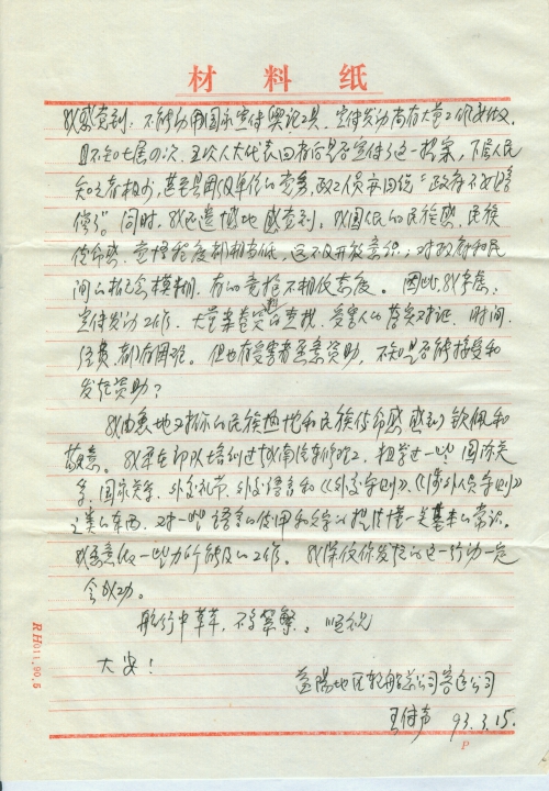 我由衷地对你的民族热忱和民族使命感感到钦佩和敬意。我原在部队培训过城南汽车修理工,粗学过一些国际关系、国家关系、外交礼节、外交语言和《外交守则》、《涉外人员守则》之类的东西,对一些语言的使用和文字的提法懂一点基本的常识。我愿意做一些力所能及的工作。我深信你发起的这一行动一定会成功。