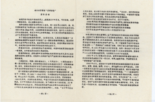 在去年10月的《读者文摘》上我看到了由你发起的民间向日索赔受害赔偿的行动的报道。我在你的一片爱国热忱和民族精神的感召下,也投身于这一行动中。我印刷了千多份宣传提纲和几百份登记表格,走访了一些地方,查找到了一批受害者。(我把国共两军抗战伤亡的也列入了登记,但在宣传上没有用文字直接提出来,考虑军队是国家工具,民间发起不带政府概念,但我把这批人算在1000多万伤害的平民伤员中,不知是否得当,请指示。)