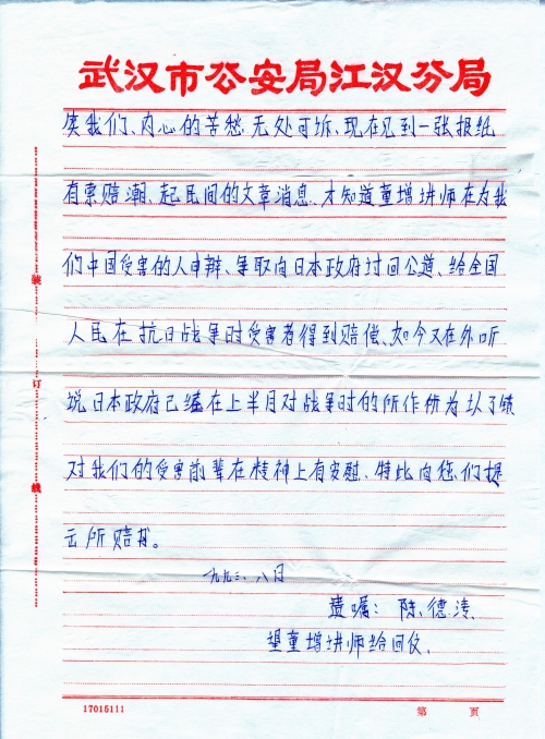 我祖父陈辉,祖母刘月华,1938年日本鬼子占领安徽前皆同我的父亲陈楚雄逃难到湖北汉口,随日本侵略军打到湖北、他们跑到法[租]界避难、当时日本鬼子在汉口开一家豆腐场招女工为名,骗进豆腐场后就被送汉口日本[租]界,吉庆里充当慰安妇,在这中间我们家见到有人送信,即去找,但是有日本鬼子兵守门,不得进去,后来从多方打听,据说被送去荆州沙市前线去了,从此,再也没有下落,几十年来我们家为了顾面子,怕人知道嘲笑我们,内心的苦愁无处可拆,现在见到一张报纸有索赔潮,起民间的文章消息,才知道童增讲师在为我们中国受害的人申辩,争取向日本政府讨回公道,给全国人民在抗日战争时受害者得到赔偿,如今又在外听说日本政府已经在上半月对战争时的所作所为认了错,对我们的受害前辈在精神上有安慰,特此向您们提出索赔书。